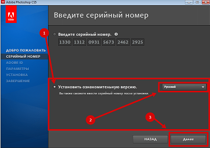 5. Далее в появившемся окне введите либо серийный номер или нажмите на «Ознакомительная версия» и позже активировать любым из двух способов.